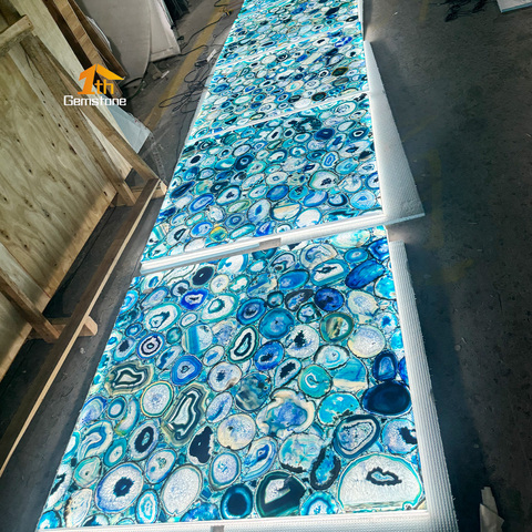 विशिष्ट रेस्तरां सजावट बैकलिट ब्लू क्रिस्टल एगेट यूनिक्स पारदर्शी पत्थर फर्श टाइलें