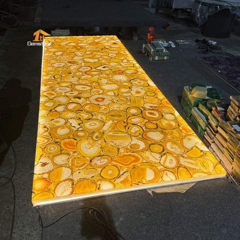 उज्ज्वल रंगीन बैकलिट पीले प्राकृतिक क्रिस्टल एगेट पारदर्शी पत्थर रसोई द्वीप बार काउंटरटॉप